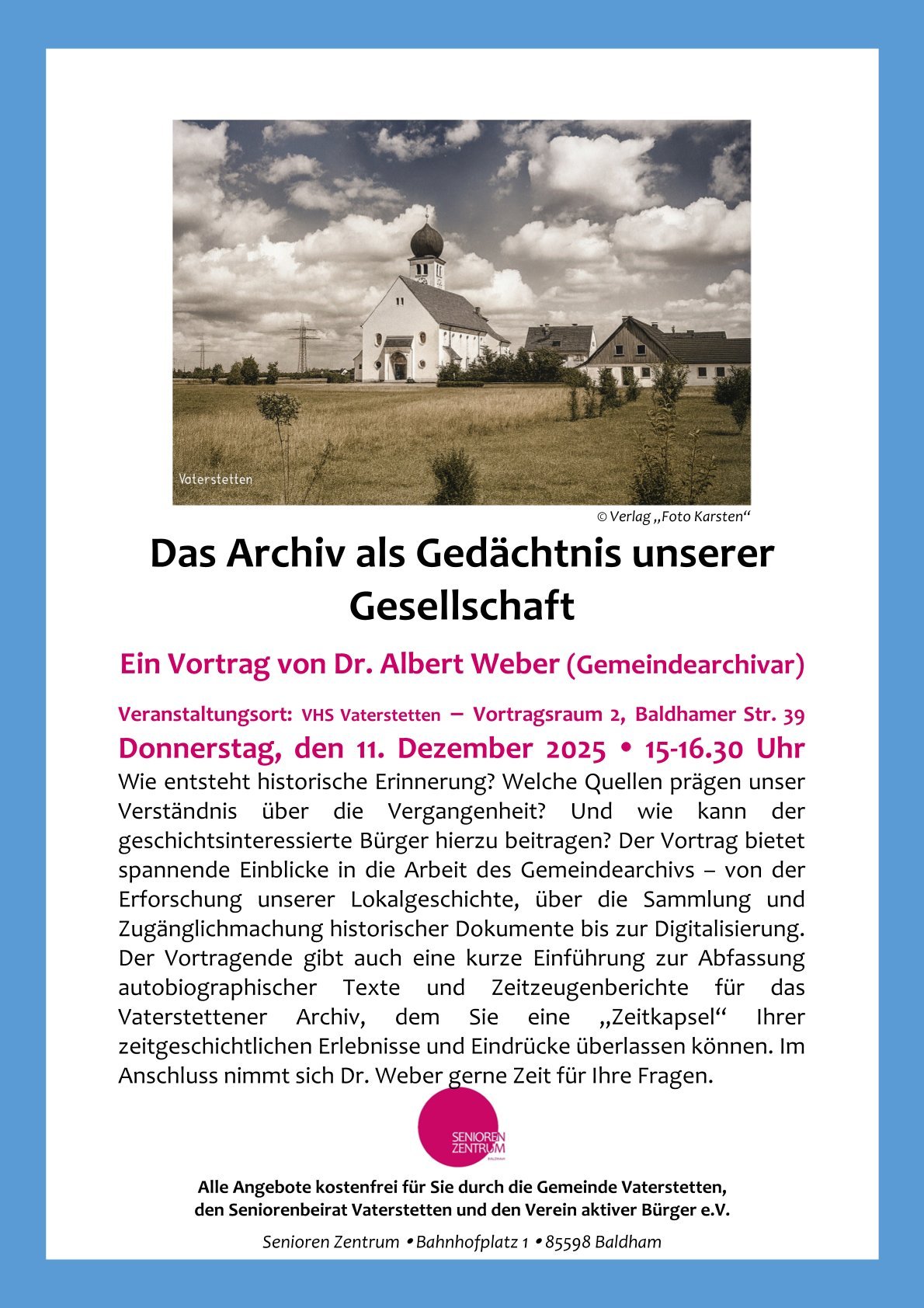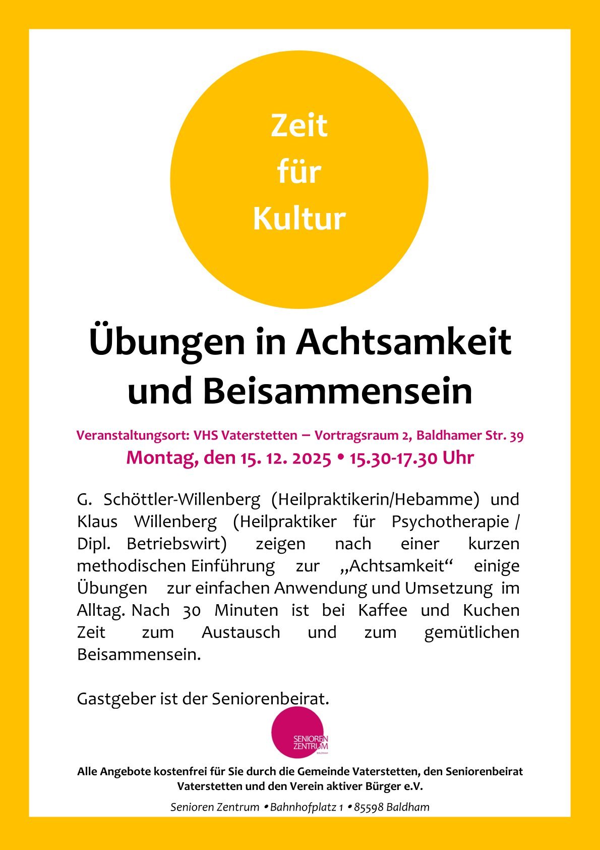 Bitte beachten Sie, dass alle Veranstaltungen bis auf Weiteres in der VHS Vaterstetten statt finden. Die entsprechenden Räume werden vorab bekannt gegeben oder am Veranstaltungstag ausgehängt.